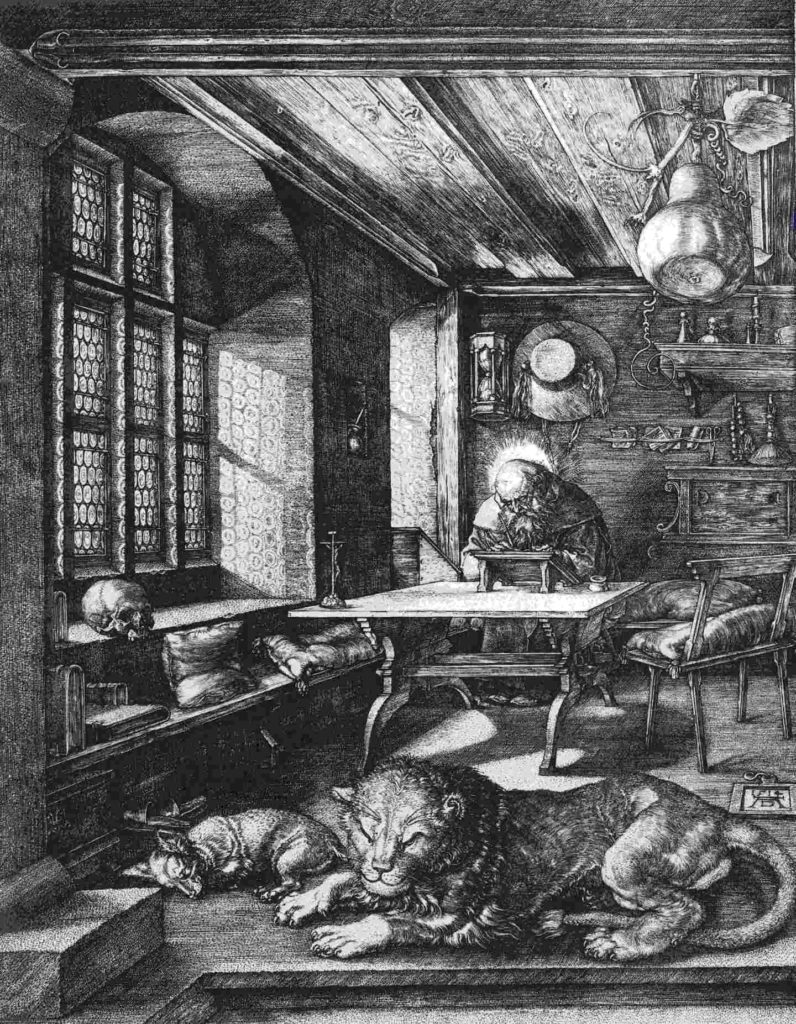 Es ist es schon nun einige Monate her, daß ich in einem ernsthaften Erwägungsprozeß „Kunst mit Konferenztechnik: Ja oder Nein?“ Teilnehmer, Freunde und Bekannte befragte, was sie von einer Kunstgeschichte im modernen Gewand halten würden. Die meisten damals Befragten rieten mir ab, weil unsere Kunstgespräche spontan und emotional seien und die persönliche Ansprache durch nichts zu ersetzen wäre. Und die fremde Technik sei ein Hemmschuh für das Gemeinschaftserleben, was vor allem Ältere zu Fall bringen würde. Nun bin ich seit Wochen damit beschäftigt, mich technisch „schlau“ zu machen und dem ein oder anderen über die Hürden der Zoom-Einwahl hinweg zu helfen. Nie hätte ich gedacht, daß die damit verbrachten Stunden „emotionaler“ sein würden, als die ganze Kunstgeschichte der letzten Jahre! Zunächst natürlich einmal für mich selbst, weil ich nie ein Technikverständnis von Grund auf erlernt habe, sondern ein stückchenweises Zusammenfummeln für meine Bedürfnisse ausreichend fand. Auch habe ich mir das ganze Computervokabular nie angeeignet. Die Dialoge mit meinem nervenstarken Gatten hätten Stoff für eine erheiternde Satire abgegeben. „Kannst Du mal bitte kommen? Das eine Dings funktioniert nicht und geht auch nicht weg und das Bild, das ich haben will kommt nicht“. „Was für ein Dings?“ „Ich weiß nicht wie das heißt. Wenn man eben auf diese eine Taste drückt.“ Und was hast Du eben gemacht? Wie bist Du dahin gekommen?“ „Ich weiß es nicht. Es passierte. Eigentlich habe ich gar nichts gemacht.“ Und von meinen Flüchen bezüglich unserer technikaffinen Gesellschaft will ich gar nicht reden. Aber als es dann erste Erfolgserlebnisse gab und ich sicherer wurde, kam auch der Spaß und die gute Laune zurück. Ich und Wir haben dann einer ganzen Anzahl Menschen dabei geholfen das Licht meines Studierzimmers zu erblicken, welches sich in ein Sende-und Empfangsstudio verwandelte. Eigentlich ist damit ein Menschheitstraum in Erfüllung gegangen: Guck-Telefon! (Mit 14 wäre ich dafür noch durch die Hölle gegangen…) Klar habe ich vor Jahren schon geskypt, aber die Verzögerungen machten es irgendwie uninteressant. Dieser Tage nun zoome ich mit ganzen, fast verlorenen gegangenen Gruppen und es ist ein tolles Wiedersehen. Nicht nur zwischen mir und den Teilnehmern, sondern auch innerhalb der „Community“. An einen Künstler mußte ich immer wieder denken: an Leonardo, den genialen Ingenieur, der u.a. Flugmaschinen konstruierte und in unserer Zeit sicher freudig an diesen Neuerungen partizipiert hätte und an das Bildmotiv des „Hl. Hieronymus im Gehäus“ besonders schön bei Dürer, der in seiner Studierstube fleißig seine Übersetzungen tätigt und in bester Gesellschaft, nämlich der eines friedlichen Löwen Schriften und Bücher studiert und sicher auch Bilder betrachtet und damit die „Welt“ bei sich zu Gast empfängt. Beides Renaissancekünstler, Zeitalter der „Wiedergeburt“… und in der Stunde dann mehr davon…